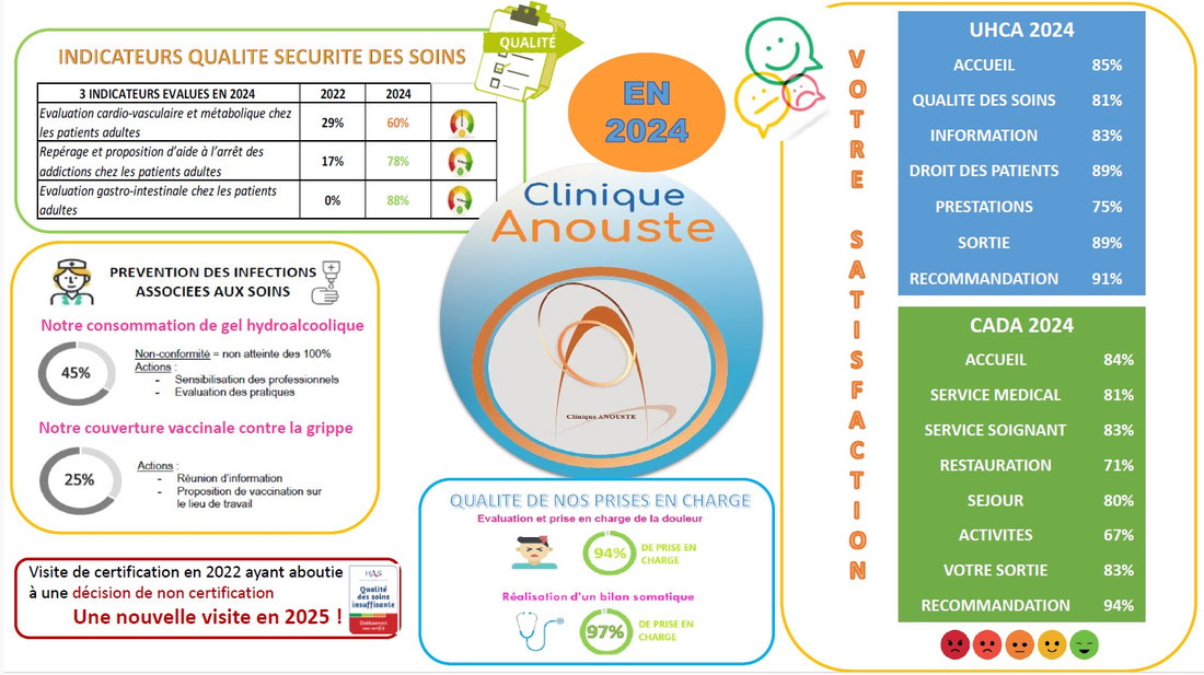 La clinique Anouste a élaboré et met en œuvre sa politique d’amélioration continue de la qualité et de la sécurité des soins et une gestion des risques visant à prévenir et traiter les évènements indésirables liés à leurs activités. Un programme d’action de la qualité et de la sécurité des soins est élaboré et suivi annuellement.
