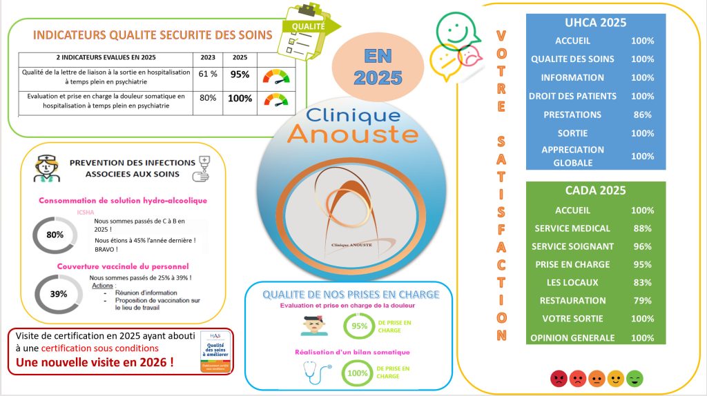 La clinique Anouste a élaboré et met en œuvre sa politique d’amélioration continue de la qualité et de la sécurité des soins et une gestion des risques visant à prévenir et traiter les évènements indésirables liés à leurs activités. Un programme d’action de la qualité et de la sécurité des soins est élaboré et suivi annuellement.